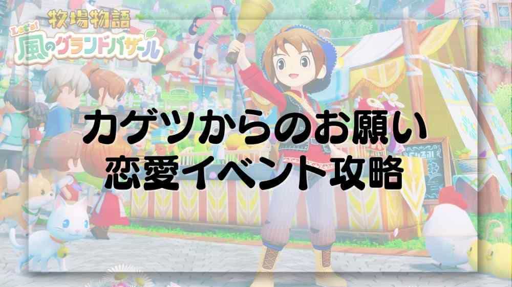 Nintendo Switch・Nintendo Switch2・Steam用ソフト『牧場物語 Let’s! 風のグランドバザール(ぼくものバザール/グラバザ)』の結婚パートナー候補の一人、カゲツ。カゲツと結婚するには『カゲツからのお願い』と『カゲツの恋愛イベント』の攻略が必須です。この記事では、カゲツと結婚する方法とカゲツからのお願い・カゲツの恋愛イベント攻略を徹底解説していきます!