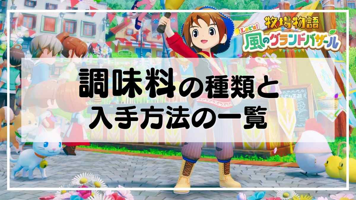 Nintendo Switch・Nintendo Switch2・Steam用ソフト『牧場物語 Let’s! 風のグランドバザール(ぼくものバザール/グラバザ)』では、さまざまな料理が作れます。調味料を使う料理もありますが、イマイチ調味料の入手方法が分からないものです。この記事では、調味料の種類と入手方法を一覧で掲載しています。ぜひ参考にしてみてください!