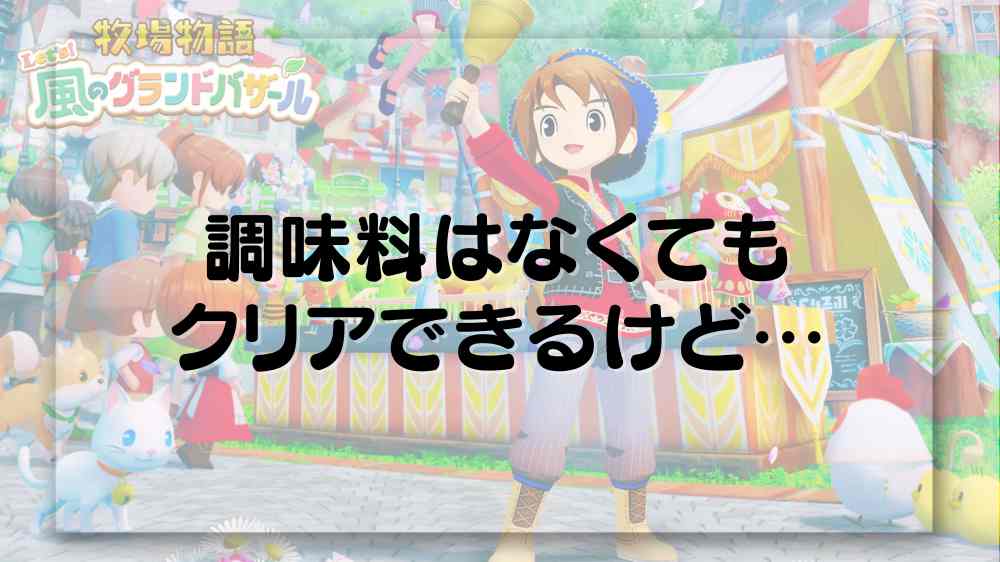 牧場物語風のグランドバザールでは、調味料はなくてもゲームをクリアできますが、調味料もあるとゲームを進める上で楽しさが少し上がる気がします♪