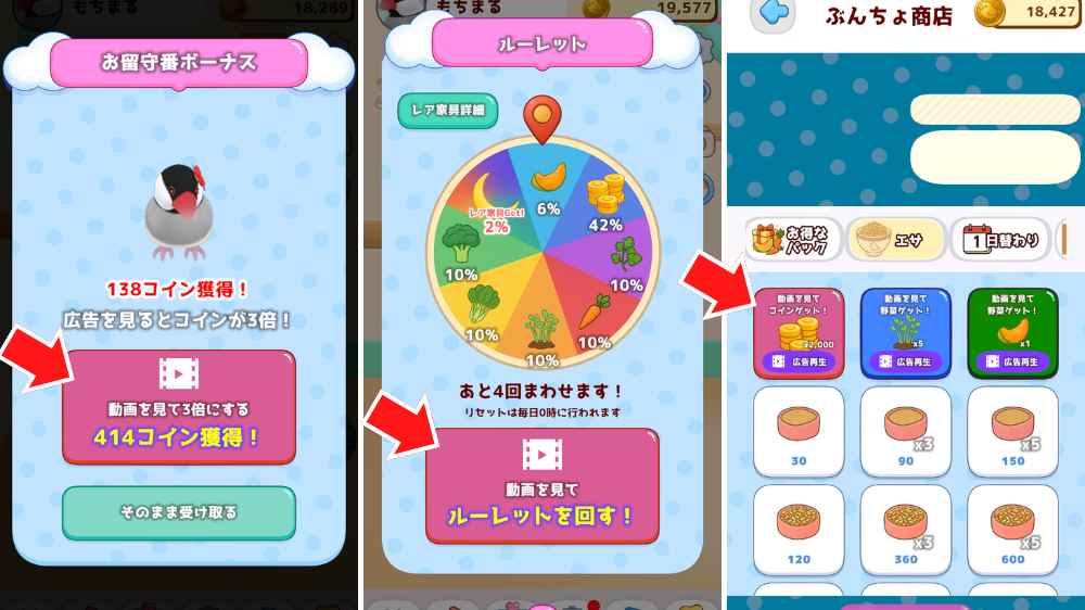 『しあわせ文鳥LIFE』は、インストールも基本プレイも無料です。そして現在はゲーム内で広告を見れば、アイテムに困ることがない仕様です。