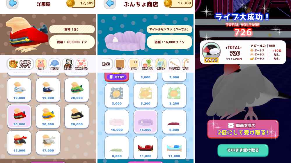 また、お部屋の模様替えや、ライブ会場で文鳥がアイドル活動することもできちゃう、なんともユニークなゲームです。