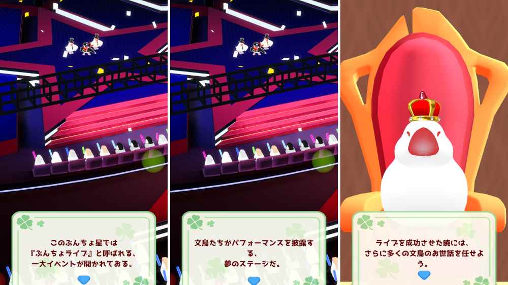 他の動物育成シミュレーションゲームとは少し違って、こどもから大きく育てていくのではなく、文鳥が踊るライブを成功させるために文鳥を育てるゲームというのもユニークで面白いですね。
