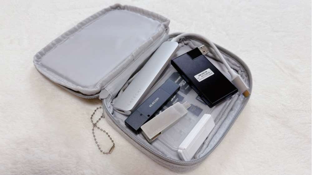ポーチにクッション性があるので、USBメモリーやSDカード、USBハブも入れてみました↓