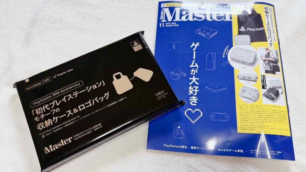 MonoMaster(モノマスター) 2025年11月号は、初代PlayStationをモチーフにしたポーチ&ロゴバッグの豪華2点セットが付録✨