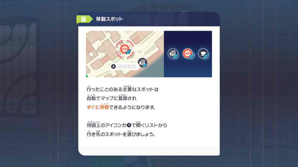 行ったことがあるポケモンセンターやカフェなどの主要なスポットは、自動でマップに登録され、マップからファストトラベル(瞬間移動)できるよになります。
