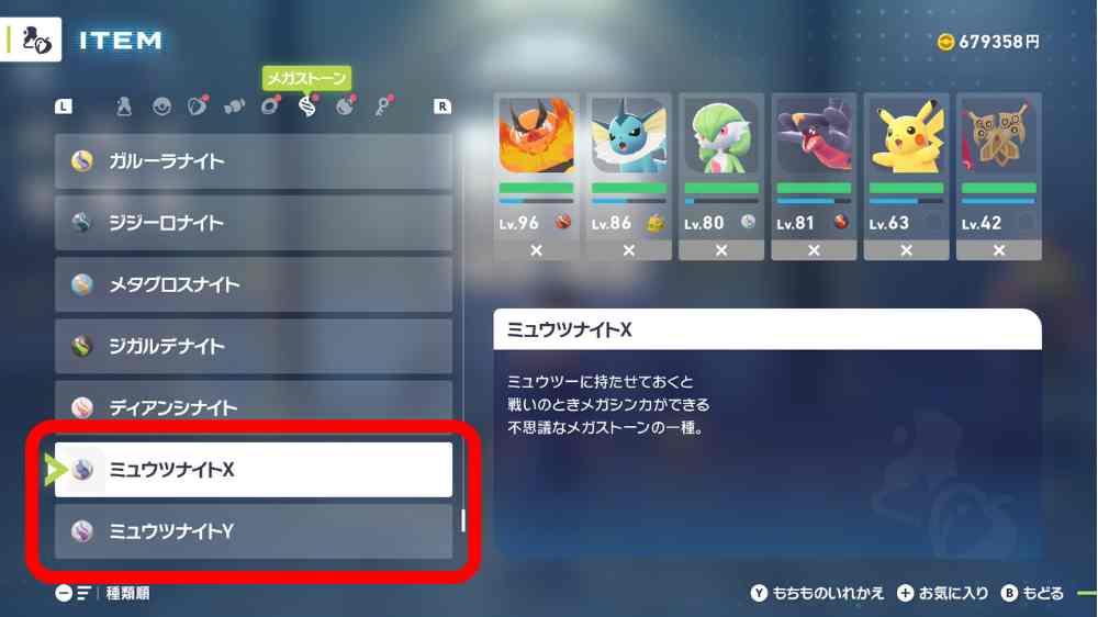 ふしぎなおくりもので受け取った「ミュウツナイトX・Y」は、ポーチの「メガストーン」の欄に自動で入っています。