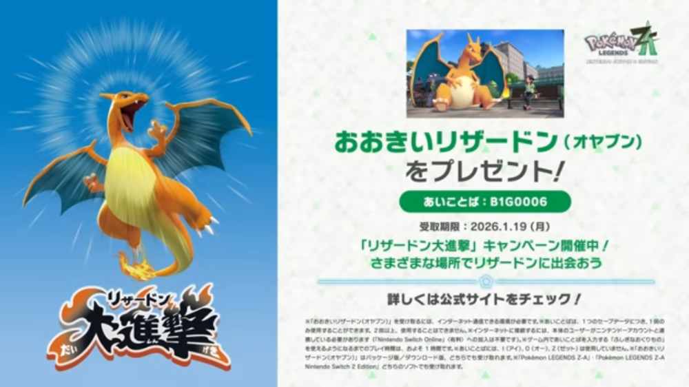DLC『M次元ラッシュ』配信を記念して、ポケモンZAの「ふしぎなおくりもの」で、オヤブン個体の大きいリザードンがプレゼント配布されています。